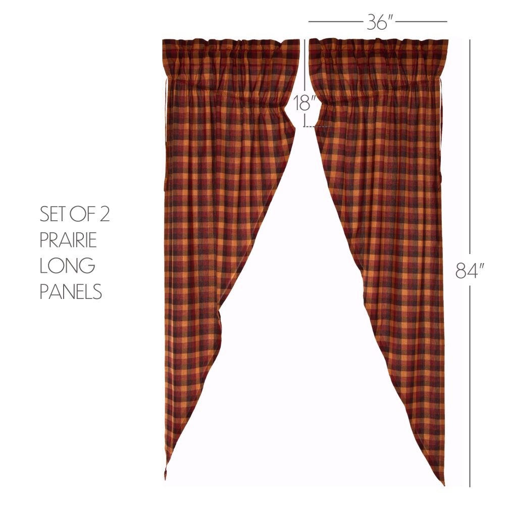 Decorate your windows with a touch of bold, rustic country style with this charmingly designed and thoughtfully crafted window panel set. Displaying an adventurous country look with a deep, cabin-inspired traditional plaid in burgundy, mustard yellow and raven black, the Heritage Farms Prairie Panel Set 84x36x18 enhances your home decor with an warm, cozy lodge feel. The gracefully angled drapes perfectly frame windows providing a bit of polish for your home. Our fully lined prairie panels come with built in drawstrings to adjust each panel to meet your style needs, along with a curtain rod pocket for easy hanging. Includes two matching panels for a perfectly dressed kitchen or living room window.