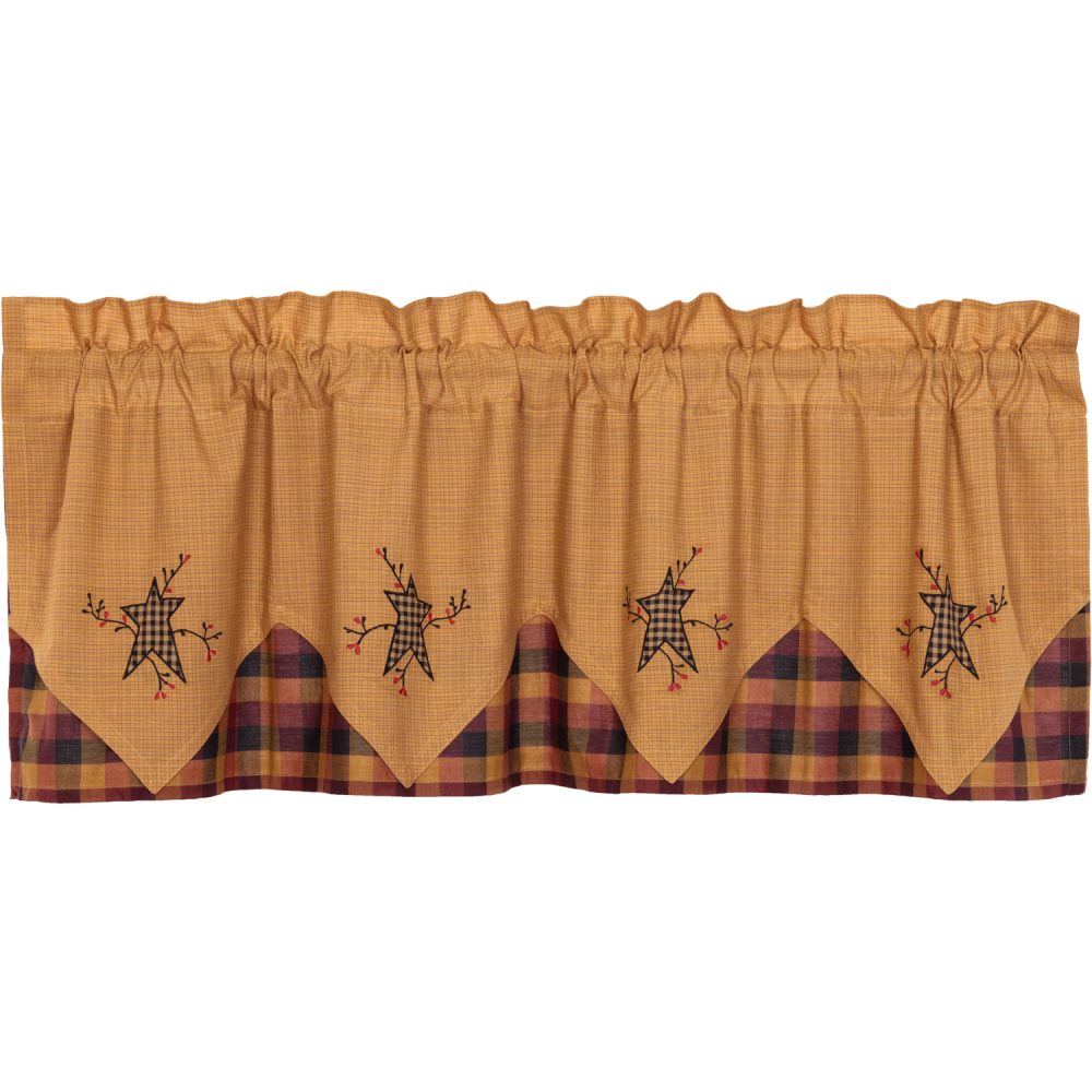 Add a darker rural look to any window with the Heritage Farms Primitive Star and Pip Valance Curtain 20x60. This country style curtain is layered and features a mustard plaid base fabric accented with applique primitive stars and embroidered twig and pip berry vines. The Bottom layer complements the top layer with large-scale deep burgundy, mustard, and black check fabric, creating a sawtooth pattern on the top layer to create a unique, old-fashioned twist - lined with white cotton to reduce fading and light penetration.