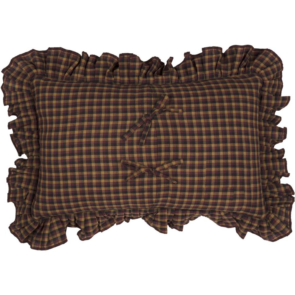 Felt, burlap, ruffles, applique. This pillow has it all! The Heritage Farms Primitive Stars Pillow measures 14x22 inches and features a black felt base for a soft, cozy texture that is accented by folk-art style stars in a tan checked applique. To add a finishing flourish, the accent pillow includes a unique double ruffled edging with a tight natural tan burlap ruffle over a burgundy, mustard yellow and black plaid ruffle. The throw pillow reverses to plaid matching the outer ruffle with tie-style closures for easy cleaning. Add this accent piece to any chair, sofa or bench for an instant upgrade in primitive country style. Coordinates with the Heritage Farms Collection by VHC for everything you need to blanket your home in cozy country comfort.