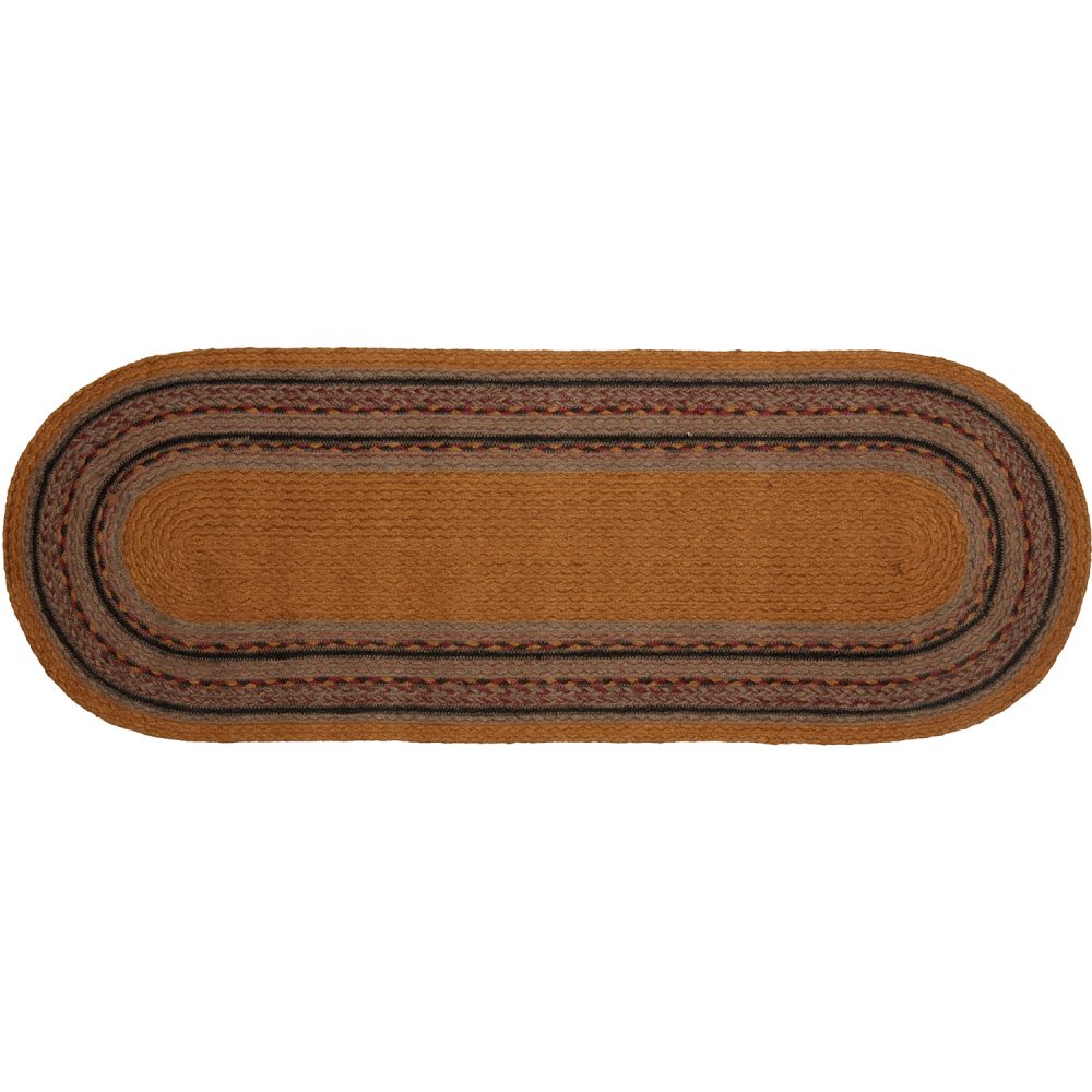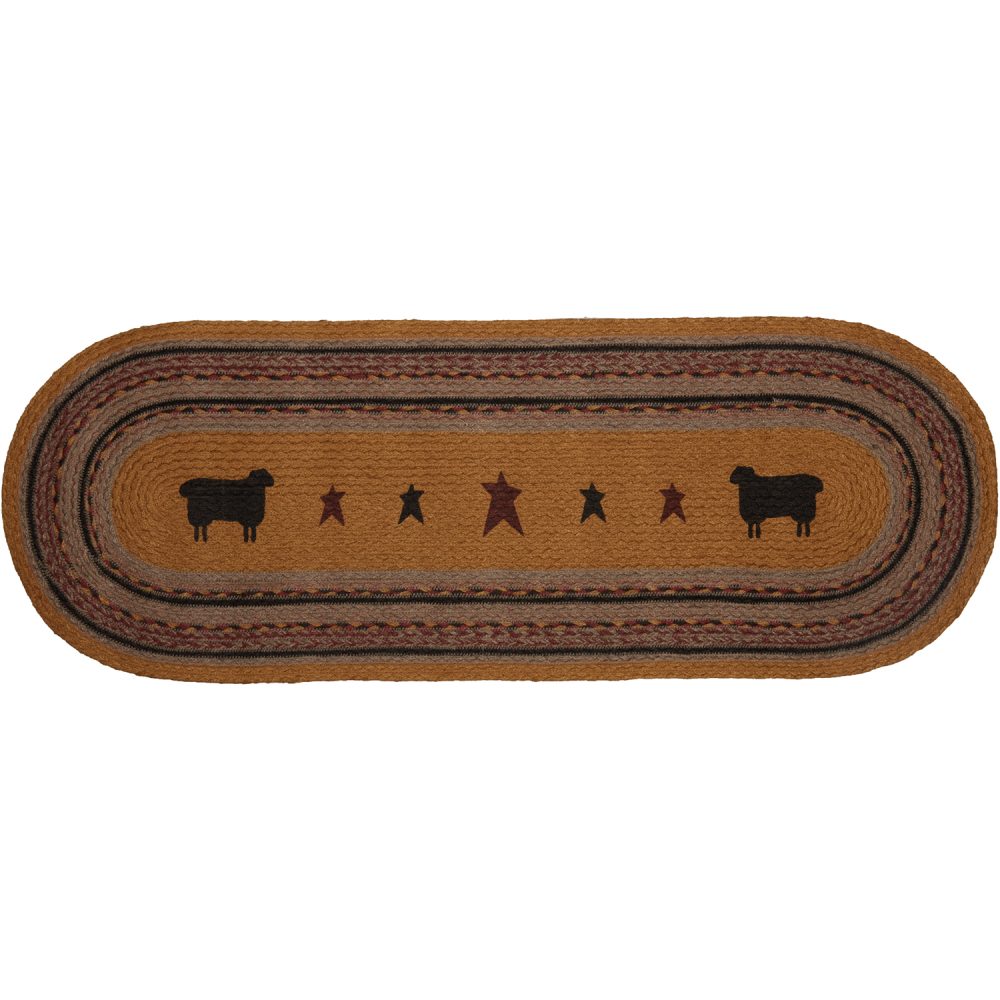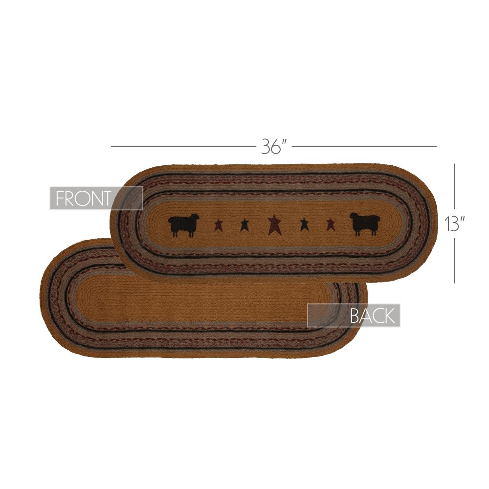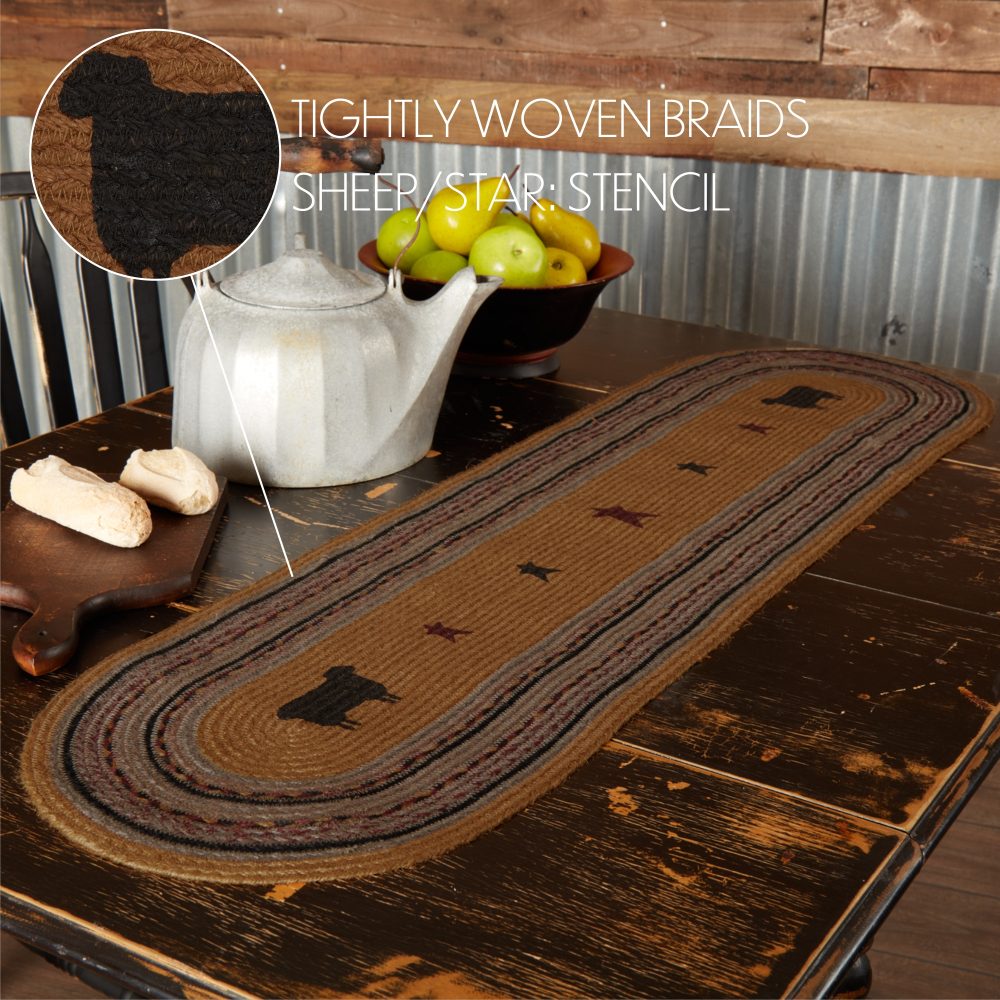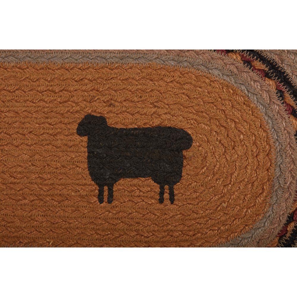 Enhance the look of your dining table with the Heritage Farms Oval Sheep Jute Runner. Featuring concentric, mixed braids of tan, grey-blue, and burgundy for a classic primitive, rustic look. Sheep stenciling bookending primitive stars adds a homey flair to this runner. This 13"x36" table runner contains machine stitching that holds the braiding together even with increased wear and tear.