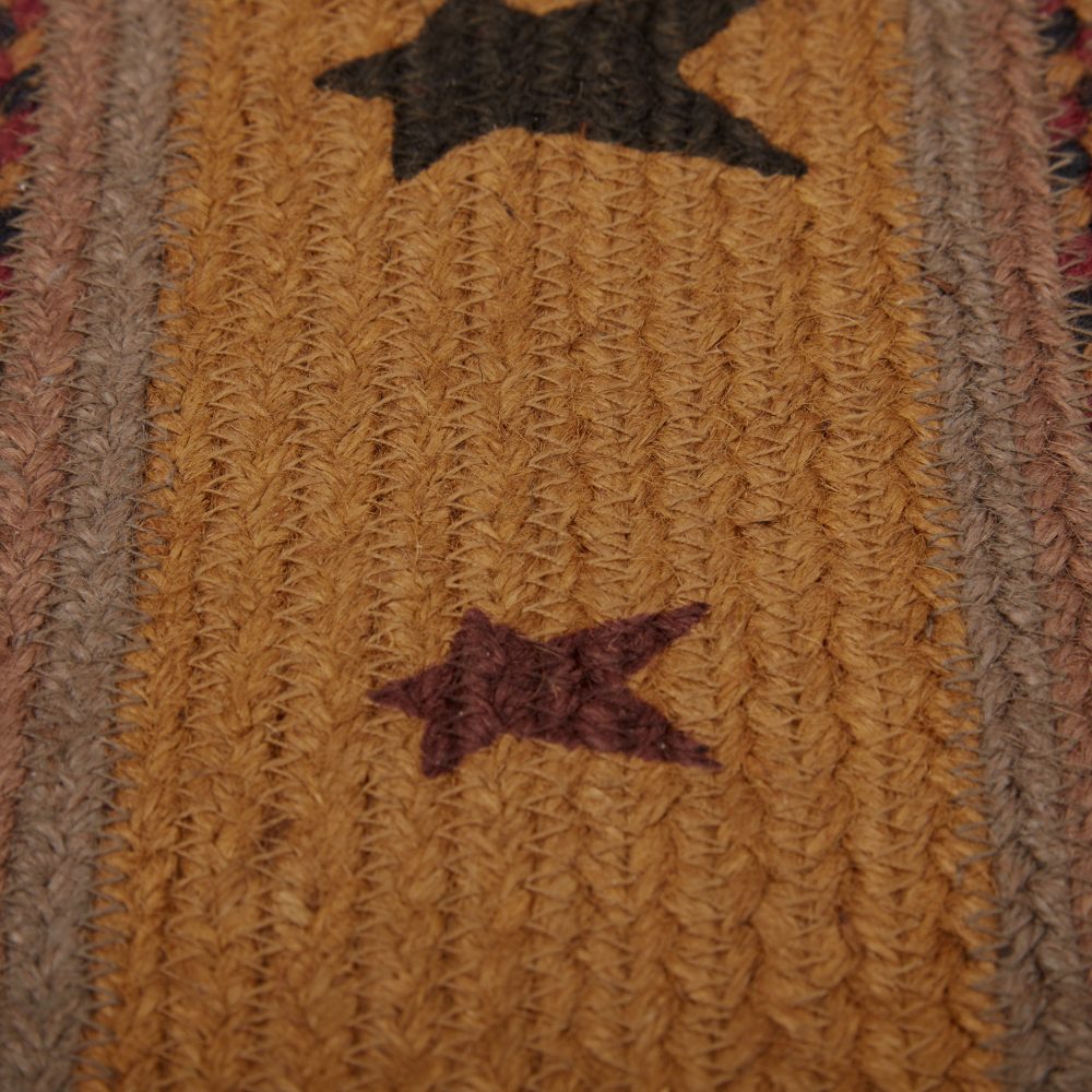 The Heritage Farms 8.5"x27" Jute Stair Tread brings a rustic look to your staircase. Weathered sheep bookending primitive stars are stenciled over beautiful jute surrounded by concentric braids of mustard-tan, grey-blue, and burgundy. Latex spray on the reverse helps prevent minor slippage. We recommend using an anti-skid pad for safety.