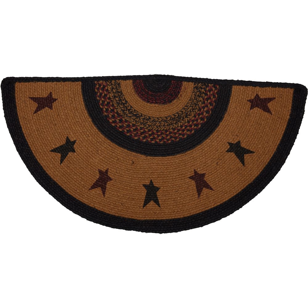 Create a warm, homey feeling with deep primitive colors in a curl-resistant jute blend that adds style and safety anywhere a small accent rug is needed. The Heritage Farms Jute Rug measures 16.5x33 inches and features a classic half circle shape and tight braids constructed with a durable jute blend. The special blend relaxes faster and stays flat. The unique shape of this rug makes it the perfect fit for doorways and in front of kitchen sinks. Features a blend of mustard tan, raven black and burgundy with stenciled star accents for a dark, rustic look that complements a wide array of country farmhouse decor.