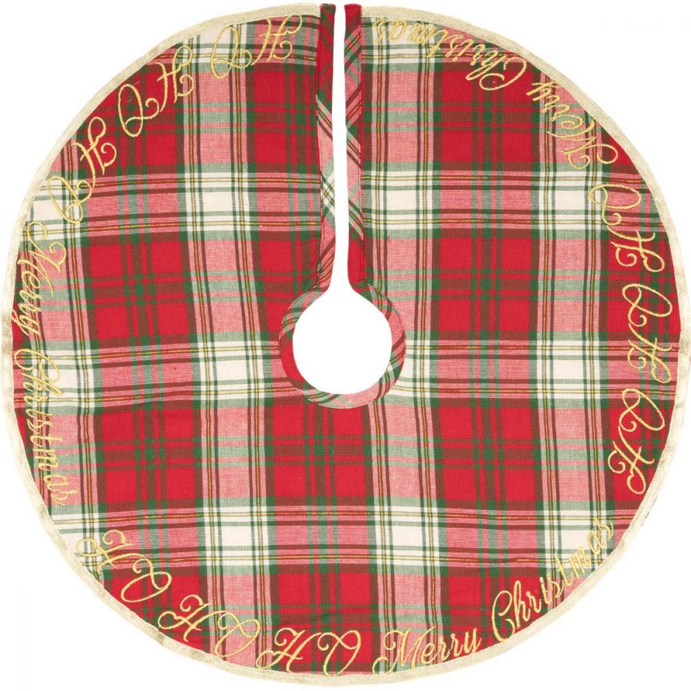 - DETAILED FEATURES: This truly festive tree skirt features cherry red, creme, and forest green plaid cotton fabric with shimmery lines of gold Lurex metallic yarn interspersed throughout. Embroidered in metallic gold thread, "HO HO HO Merry Christmas" repeats around outside edge for a touch of cheery Christmas Spirit.