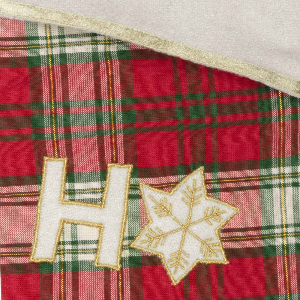 - DETAILED FEATURES: This truly festive stocking features cherry red, creme, and forest green plaid cotton fabric with appliqued “HO HO HO” in creme felt and gold rope detail. The creme felt cuff is trimmed with gold ribbon on the top and bottom for extra holiday sparkle. Finished with a slanted cuff and body lined in creme taffeta.