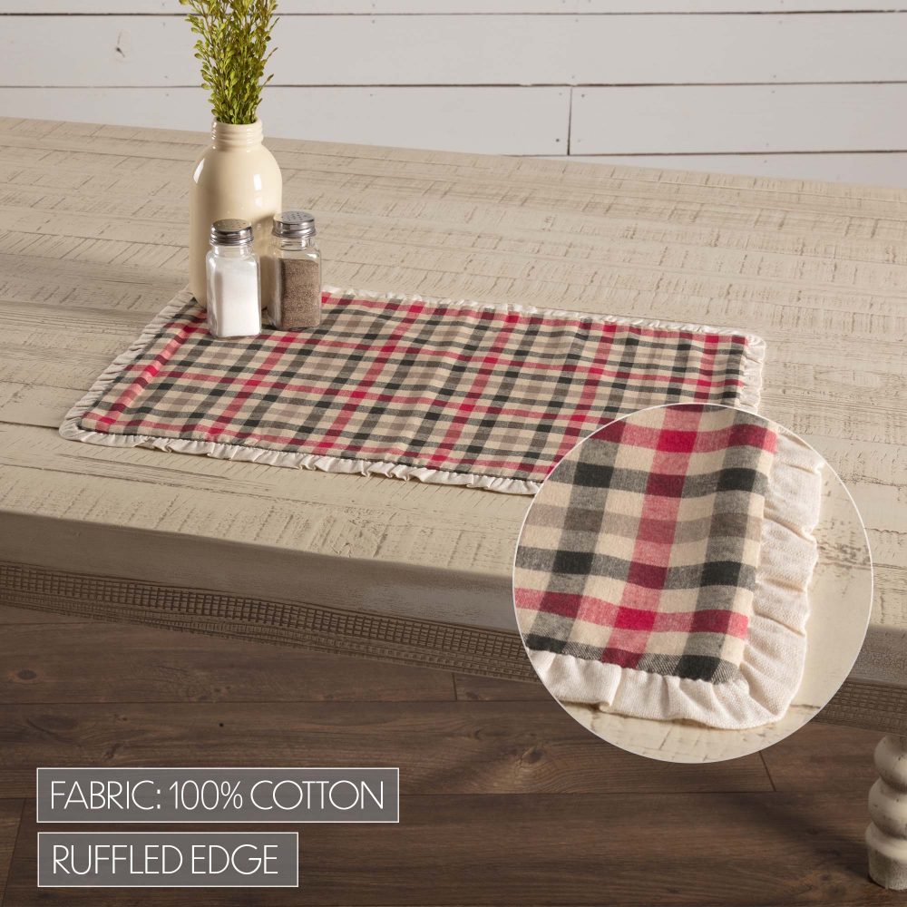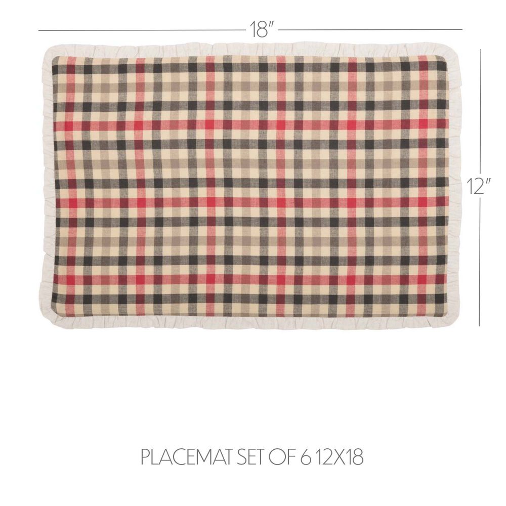 Add a soft and sweet wintry touch to your holiday decor this year with the Hollis Placemat Set of 6 12x18. A red, green, and ivory plaid is bordered by festive ruffles to give this country style Placemat Set a timeless Christmas look. 100% cotton.