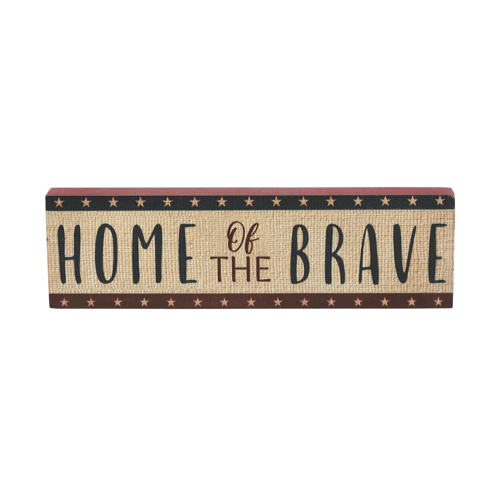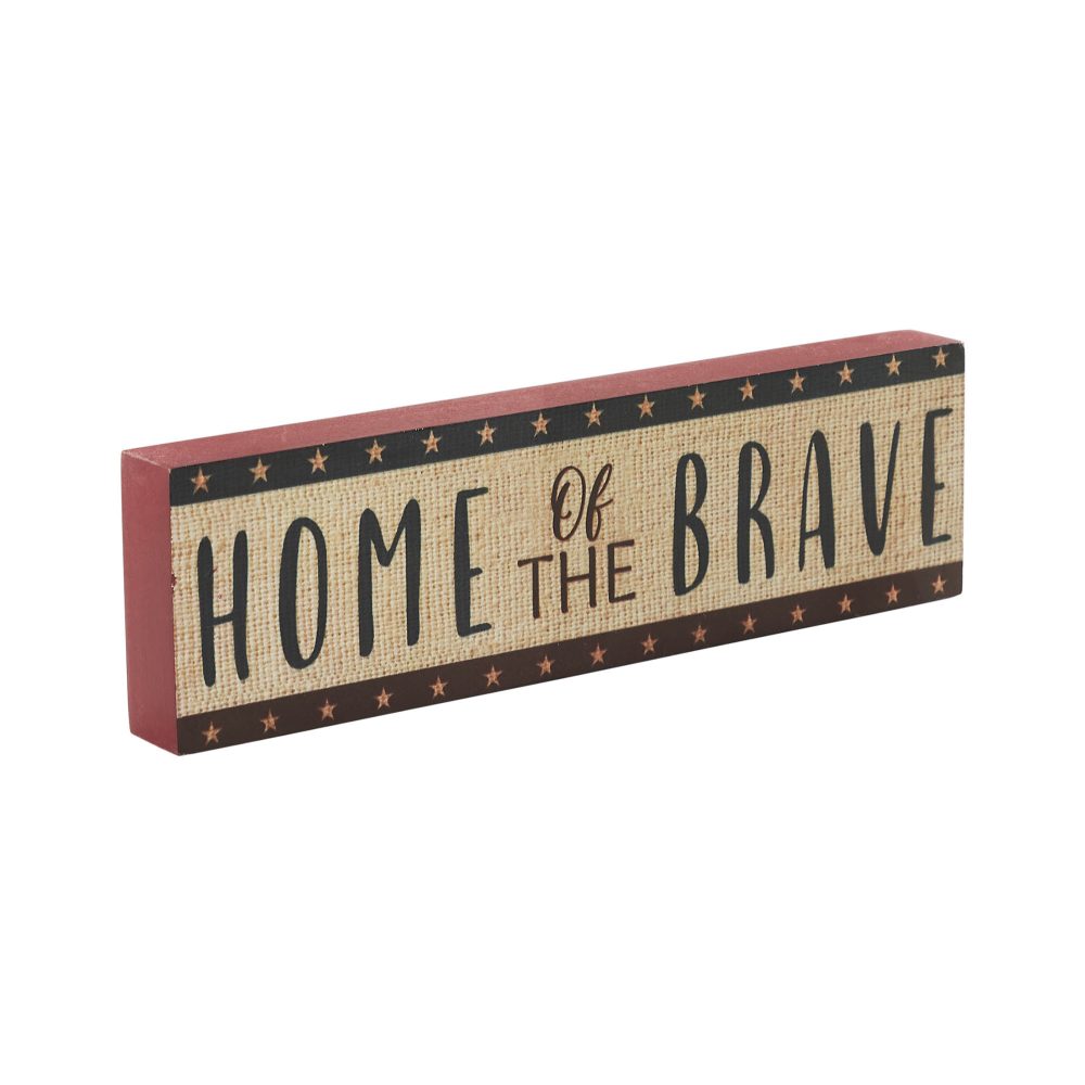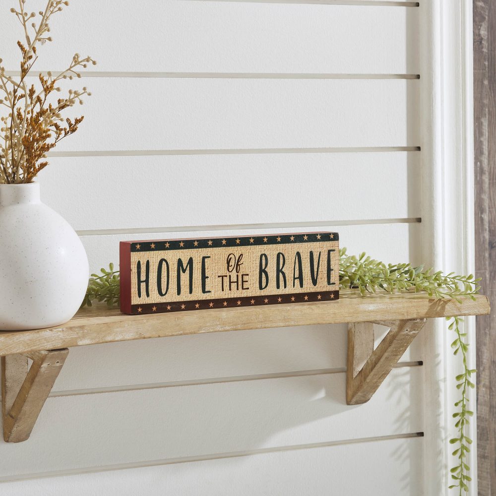 Celebrate your patriotic spirit with the VHC Brands Patriotic Home Of The Brave w/ Red Blue Star Stripes MDF Block Sign 3x10x1. This charming decorative sign features a printed tan burlap-look background, creating a rustic canvas for the inspiring quote "Home of the Brave." Accented with bands of small stars in navy blue and burgundy at the top and bottom borders, this sign captures the essence of Americana style and adds a timeless touch to your Independence Day or everyday decor. Perfect for enhancing any room, this rectangular block sign fits beautifully in living rooms, dining rooms, kitchens, bedrooms, bathrooms, or entryways. Its compact size and horizontal layout make it ideal for display on shelves, mantels, countertops, or tabletops. The classic burlap tan, navy blue, and burgundy color palette complements rustic farmhouse and country-inspired interiors, adding warmth and character to your space. Maintaining the VHC Brands Patriotic Home Of The Brave Block Sign is simple-just wipe it clean with a soft cloth to preserve its digital print and distressed finish. Whether used as a standalone piece or paired with other patriotic decorations, this MDF sign is a stylish and meaningful way to honor the spirit of freedom and bravery in your home. Its quality craftsmanship and heartfelt message make it a perfect addition to your rustic Americana decor.