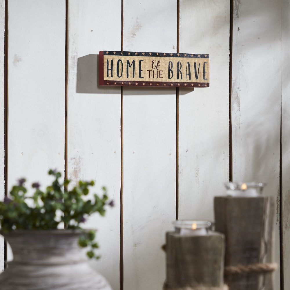 - Patriotic Quote Design: Features the inspiring quote “Home of the Brave” printed on a tan burlap-look background, adding a rustic and heartfelt touch to your decor.