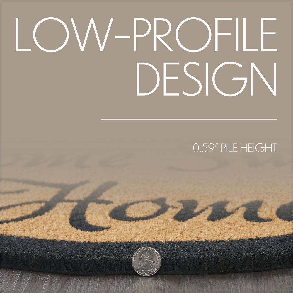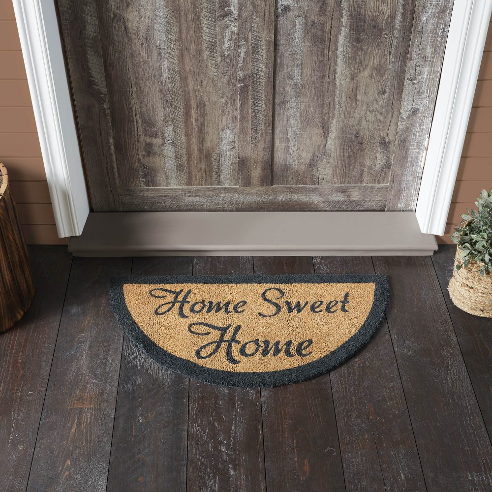 Welcome your guests with the warm, rustic charm of the VHC Brands Home Sweet Home Coir Welcome Rug Half Circle 16.5x33. This beautifully crafted doormat features the phrase Home Sweet Home in dark grey, stenciled against a natural tan coir background. Its half-circle shape adds a unique and inviting touch to any entryway, making it a perfect fit for country or farmhouse-style homes. Designed for both functionality and style, this coir rug is perfect for high-traffic areas, trapping dirt and debris while offering a cozy welcome. The durable coir fibers ensure longevity, while the non-slip PVC backing keeps the rug securely in place, providing stability and preventing slips. The Home Sweet Home sentiment adds a personal, heartwarming touch to your doorstep. For easy maintenance, simply shake or vacuum the rug to remove surface dirt. To preserve its bright colors and extend its life, it's best to keep the VHC Brands Home Sweet Home Coir Welcome Rug in a sheltered entryway. Whether placed indoors or on a covered porch, this rug combines rustic style with practical functionality, making it a great addition to any welcoming home.
