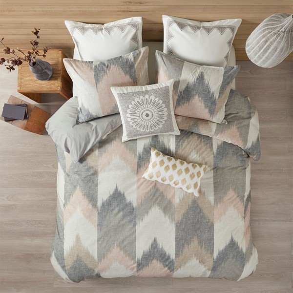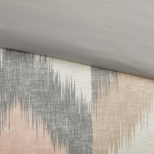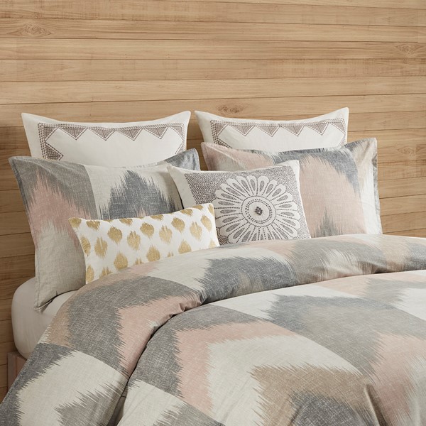 Elevate the beauty and style of your bedroom with the INK+IVY Alpine Duvet Cover Mini Set. This cotton duvet cover set flaunts a sophisticated ikat chevron print on the face with a solid reverse to create a striking modern and elegant look. The 2 matching shams coordinate with the design of the cotton duvet cover to complete this dynamic bedding set. This duvet cover set is OEKO-TEX certified, meaning it does not contain any harmful substances or chemicals, and uses an antimicrobial treatment that provides built-in freshness protection, reducing the growth of odor causing bacteria to keep fabric lasting longer. A button closure allows you to place a padded insert within the duvet cover and internal corner ties help prevent it from shifting (Insert is NOT included). Euro shams and decorative pillows are sold separately.