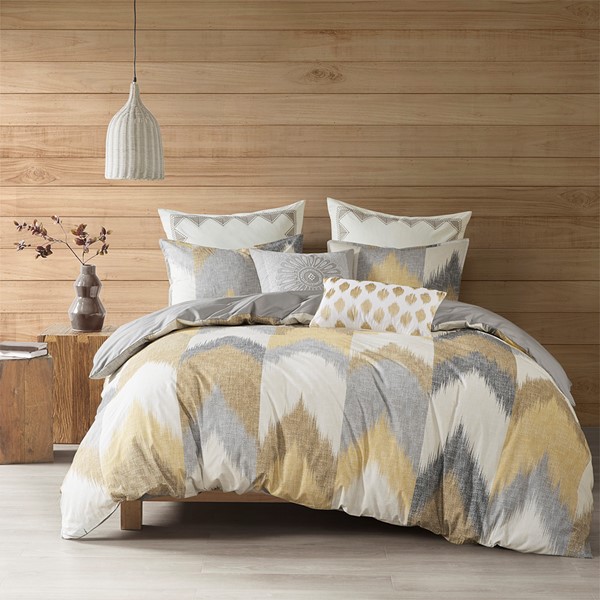 Elevate the beauty and style of your bedroom with the INK+IVY Alpine Duvet Cover Mini Set. This cotton duvet cover set flaunts a sophisticated ikat chevron print on the face with a solid reverse to create a striking modern and elegant look. The 2 matching shams coordinate with the design of the cotton duvet cover to complete this dynamic bedding set. This duvet cover set is OEKO-TEX certified, meaning it does not contain any harmful substances or chemicals, and uses an antimicrobial treatment that provides built-in freshness protection, reducing the growth of odor causing bacteria to keep fabric lasting longer. A button closure allows you to place a padded insert within the duvet cover and internal corner ties help prevent it from shifting (Insert is NOT included). Euro shams and decorative pillows are sold separately.
