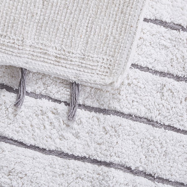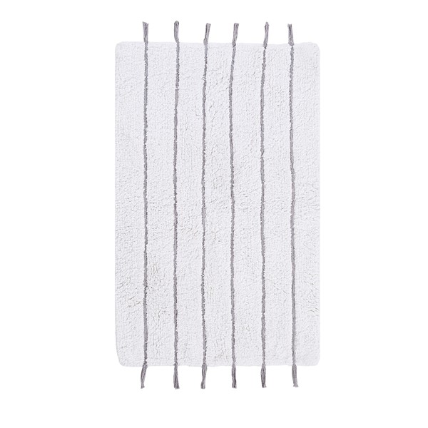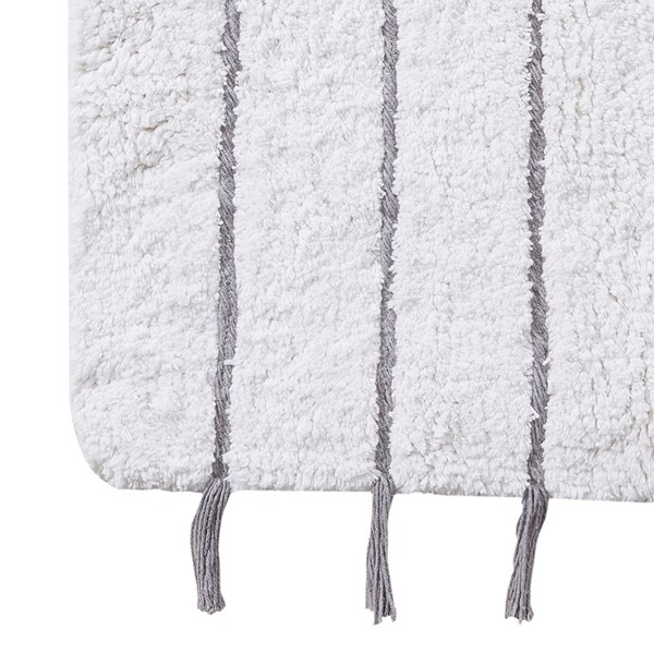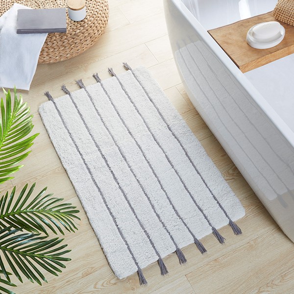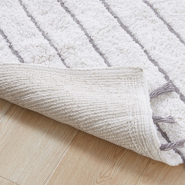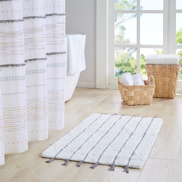 The INK+IVY Arbor Stripe Tassel Cotton Tufted Rug brings a simple yet stylish update to your bathroom decor. This tufted cotton bath rug features a woven yarn technique for a contrast textural stripe pattern, while coordinating tassel detailing at the ends provides the finishing touch for an artisan, look and feel. The soft, plush ground is featured in a light neutral hue to accentuate the design and easily coordinate to any decor; while the Non-skid resistance latex backing helps keep the bath rug in place throughout the day. Machine washable cold, this cotton tufted bath rug has a medium 0.5" pile to give your bathroom a soft touch while still clearing any standard door gap and or space. Add the perfect craftsmanship update to your home with our New INK+IVY bath rug collection; easily complete the look with any coordinating INK+IVY Shower Curtain, Bedding, and Window Collections, available and sold separately.
