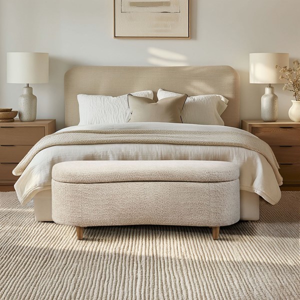Add cozy texture and stylish function to your space with the Bailey Storage Bench from INK+IVY. Upholstered in soft boucle-style fabric, this bench features a curved front and straight back so it fits neatly against a wall or bed. A flip-top lid opens to a spacious interior with ventilation holes for airflow and soft-close hinges for added safety. The padded seat offers occasional seating, making it perfect for bedrooms, entryways, or living rooms. Solid wood legs provide sturdy support with a warm, natural finish. Easy to assemble with simple leg attachment. Style and store with Bailey today.