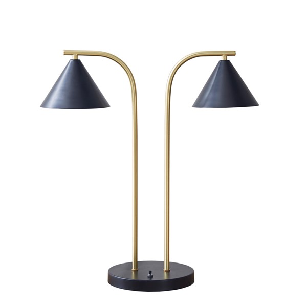 Brighten your work space or living room with refined charm of the INK+IVY Bower 2-Light Metal Table Lamp with Chimney Shades. Flaunting a two-tone finish of gold and black, this table lamp features two lights with metal cone shades to create a unique mid-century design. A round black base and black cord complete the table lamp. Uses 2 Type B light bulbs (included).