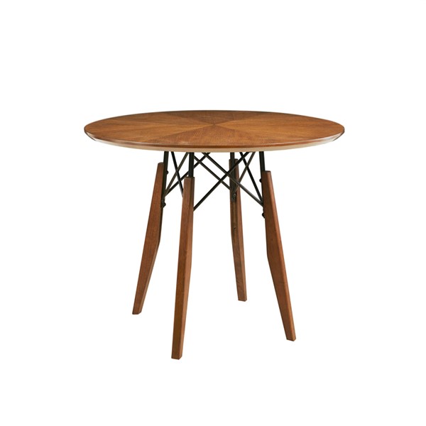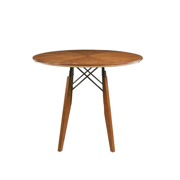 INK+IVY Clark Round Dining Pub Table offers a warm and inviting update your dining room decor. This round dining table flaunts a two tone pecan wood finish on the table top to create dimension and emphasize the mid-century look. The solid wood legs and metal stretcher provide a sturdy base and complement the table top. Perfect for a small dining nook, this round dining table can be set up at either dining height or gathering height by simply assembling the top in 1 of the 2 sets of screw holes. Assembly is required.