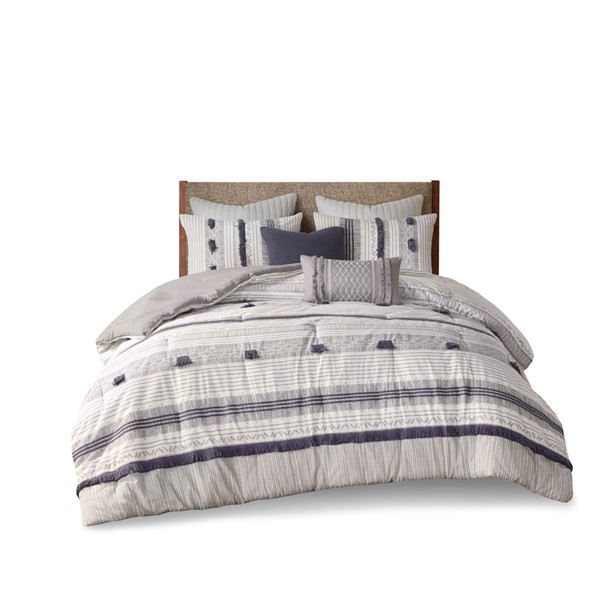 The INK+IVY Cody 3 Piece Cotton Comforter Set brings a smart combination of texture and style to your bedroom. This comforter features a grey and navy striped print on 100% cotton with pompom and trim details for a casual, yet sophisticated look, while the solid grey reverse complements the bold design. Matching shams with overlap openings, on the back, coordinate perfectly with the comforter to complete this casual bedding set. This comforter set is also OEKO-TEX certified, meaning it does not contain any harmful substances or chemicals to ensure quality comfort and wellness.