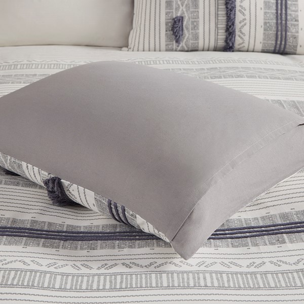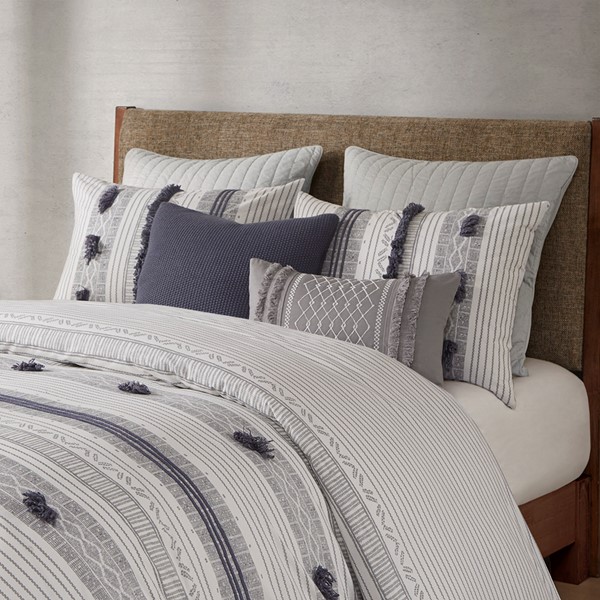 The INK+IVY Cody 3 Piece Cotton Duvet Cover Set brings a smart combination of texture and style to your bedroom. This 100% cotton duvet cover features a grey and navy striped print with pompom and trim details for a casual, yet sophisticated look. The solid grey reverse complements the bold design, while matching shams with overlap openings coordinate perfectly with this casual bedding set. This duvet cover set is also OEKO-TEX certified, meaning it does not contain any harmful substances or chemicals to ensure quality comfort and wellness. A button closure allows you to place a padded insert within the duvet cover and inside corner ties prevent it from shifting (insert is NOT included).