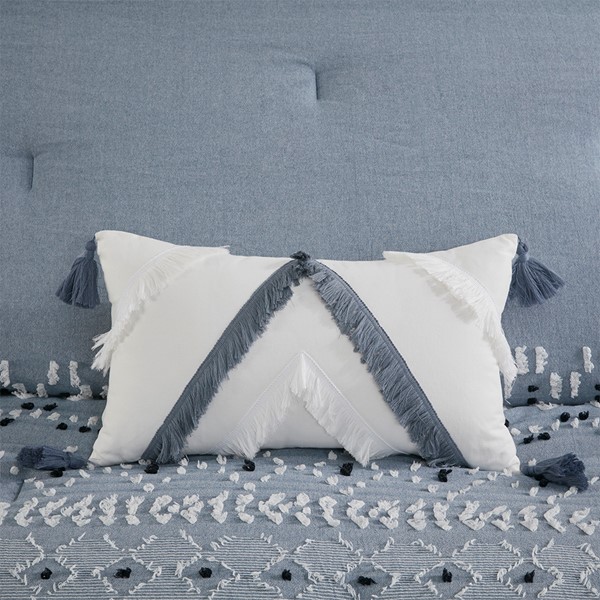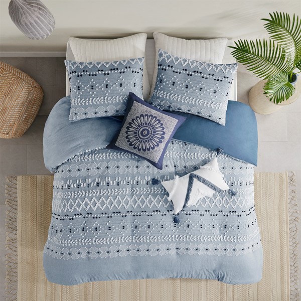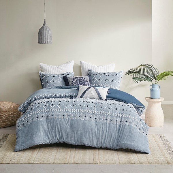 Bring boho chic to your bedroom with the INK+IVY Dora 3 Piece Organic Cotton Chambray Duvet Set. Made from soft organic cotton, this duvet features clipped yarns to create a global inspired pattern with geometric shapes and dark navy tufts. The matching shams repeat the boho design to complete the bedding set. The soft blue chambray offers a fresh update to your space. This cotton duvet set is also OEKO-TEX certified, meaning it does not contain any harmful substances or chemicals to ensure quality comfort and wellness. Button closures allow you to place a comforter insert within the duvet cover and inside corner ties help prevent it from shifting. Insert is NOT included.
