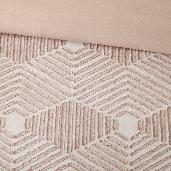 Add a rich textural look to your bedroom with the INK+IVY Ellipse Cotton Jacquard Duvet Cover Set. The cotton duvet cover features a geometric design in a blush clipped jacquard with a solid blush reverse that complements the top of the bed, for a shabby chic look. Two matching shams repeat the reversible design seen on the duvet cover to complete the farmhouse-inspired aesthetic. This comforter is OEKO-TEX certified, meaning it does not contain any harmful substances or chemicals to ensure quality comfort and wellness. Machine washable for easy care, this clipped jacquard duvet cover introduces texture and dimension to give your bedroom a one-of-a-kind update. Button closures allow you to place a comforter insert within the duvet cover and inside corner ties help prevent it from shifting. Insert is NOT included.