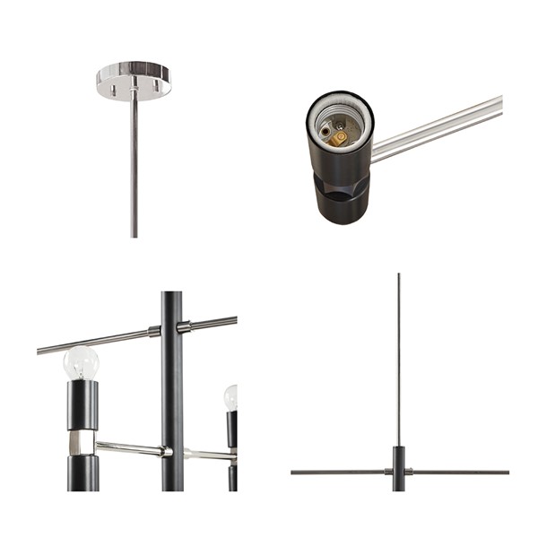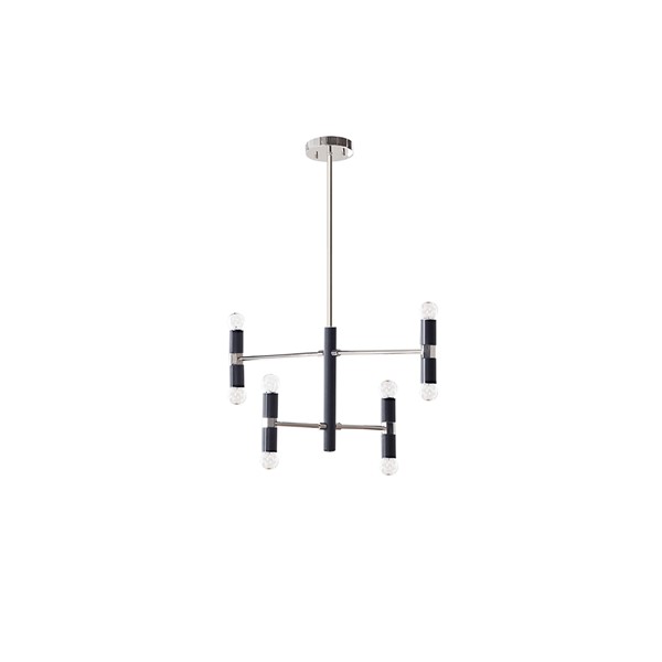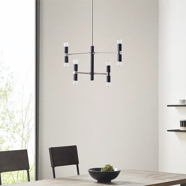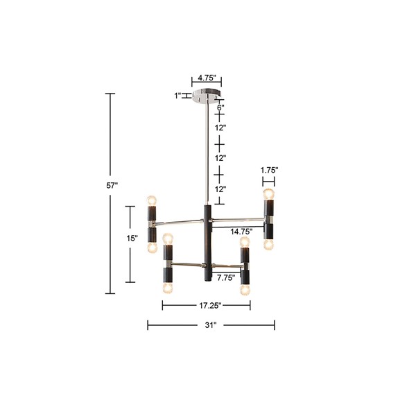 Complete your decor with the modern glam of the INK+IVY Gardham 8 Light Sputnik Sphere Chandelier. Featuring a modern black and silver two-tone linear design, this chandelier creates a bright and warm lighting ambience with its 8 light bulbs. The long arms adjust to different angles, transforming the chandelier profile from streamlined to more dramatic look. Also included are 4 piece extension rods, 3 that measure 12" and 1 that measures 6", which allow you to adjust the height between 21" and 57". Hardwired for indoor use only, this mid-century style chandelier is not compatible with a sloped ceiling and professional installation is recommended. Mounting hardware is included. Uses 8 Type A bulbs (not included), wattage 60W incandescent/13W CFL/9W LED.