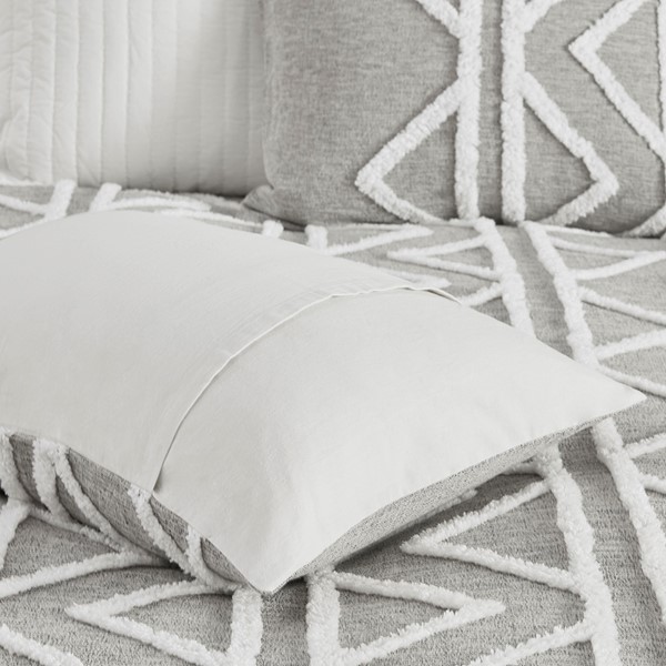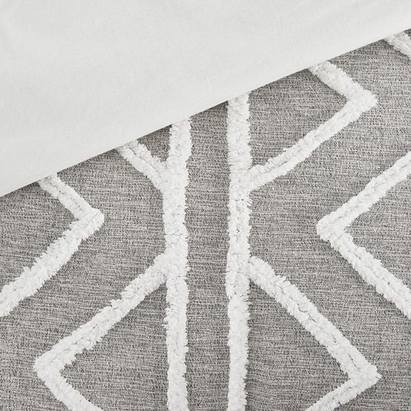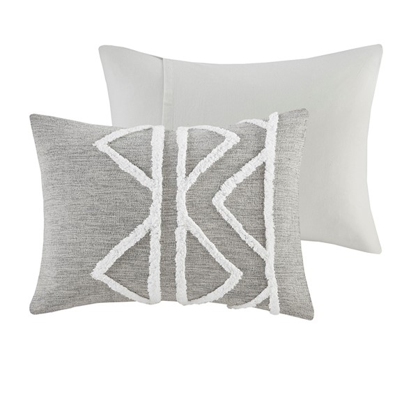 The INK+IVY Hayes 3 Piece Cotton Chambray Comforter Set with Chenille brings a perfect blend modern and boho styles to your bedroom. This cotton comforter features chenille taping and trims, in a geometric design, that contrast the grey chambray fabric, for a chic boho look. A solid reverse offers a light contrast to the top of the bed, while hidden bar tacks provide a clean, duvet-like finish. The 2 matching shams repeat the pattern of comforter to complete this globally inspired bedding set. Machine washable for easy care, this 100% cotton comforter set adds a sophisticated charm to your bedroom decor.