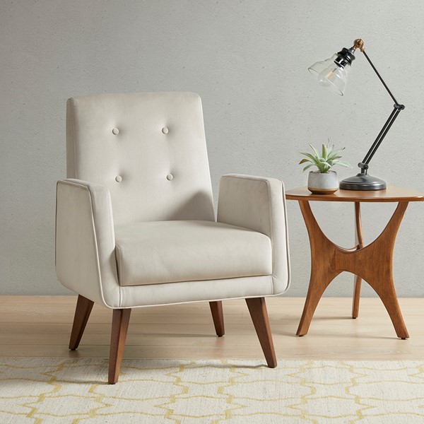 Complete your living room with the mid-century charm of the INK+IVY Lacey Accent Chair. This upholstered accent chair features a button-tufted back and welt detailing on the arms that add sophisticated touches to the design. The solid wood legs flaunt a rich walnut finish to contrast the upholstery and complete the mid-century look. Leg assembly is required.