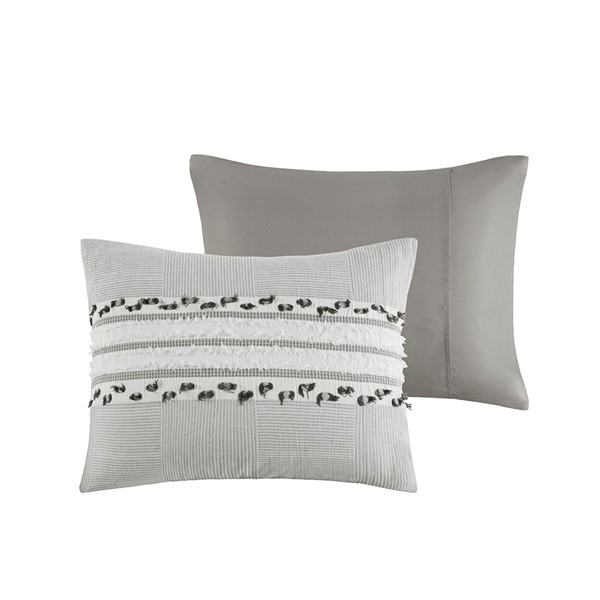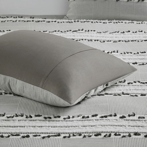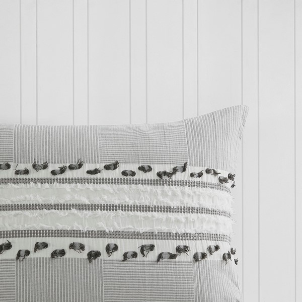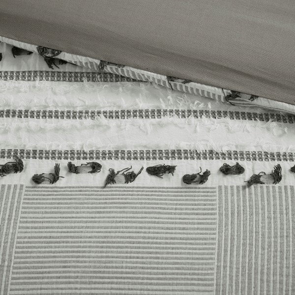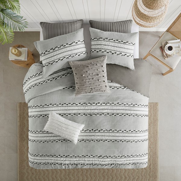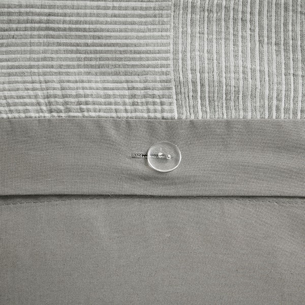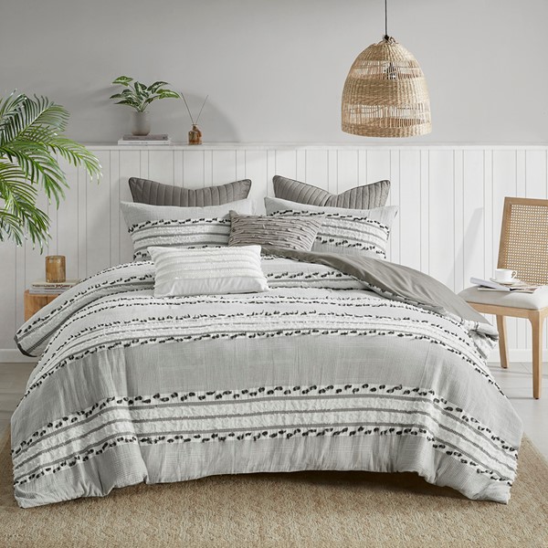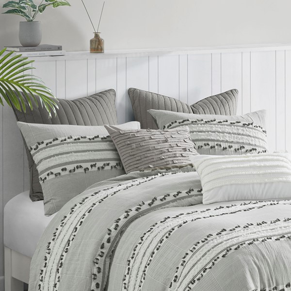 Style your bedroom with the globally-inspired charm of the INK+IVY Lennon Cotton Jacquard Duvet Cover Set. The jacquard duvet cover is made from 100% organic cotton and features a charcoal striped design on the cream base, creating a unique farmhouse allure. Two matching shams coordinate perfectly with the top of the bed to complete the comforter set. This duvet cover set is also OEKO-TEX certified, which means it is free of harmful substances and chemicals. Machine washable for easy care, this organic cotton duvet cover set elevates your bedroom decorand brings a sophisticated touch to your space. Button closures allow you to place a comforter insert within the duvet cover and inside corner ties help prevent it from shifting. Insert is NOT included.