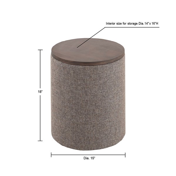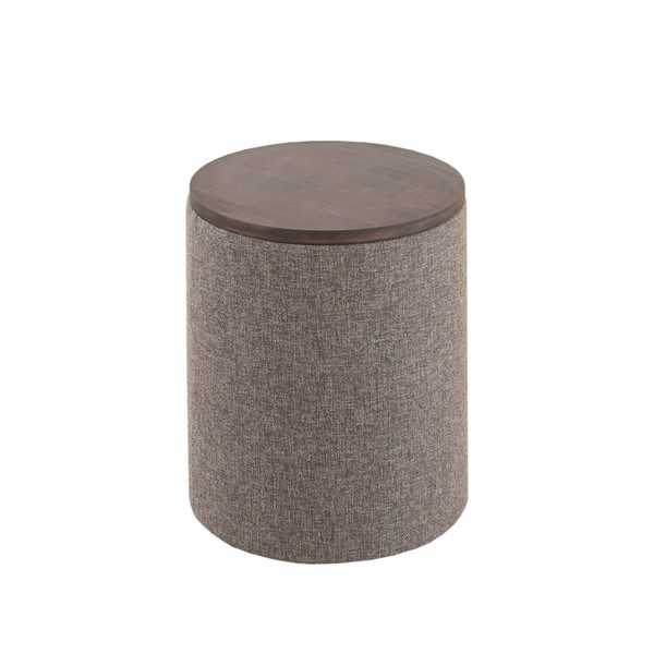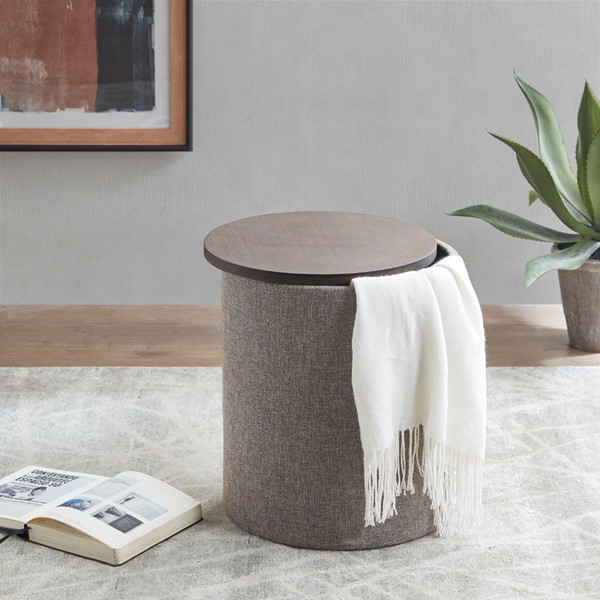 The INK+IVY Marta Storage Round Ottoman brings a sophisticated blend of style and functionality to your living room. This round ottoman is upholstered in a soft grey fabric and features a walnut finished wood top, for a chic transitional look. The wooden lid opens up to provide to plenty of storage space for books or blankets. Incorporate this round storage ottoman into your home decor to be used as an accent table, additional seating, or storage for your space.