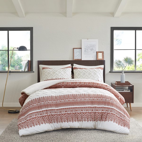 Transform your bedroom with the charming shabby chic allure of the INK+IVY Mila 3 Piece Cotton Duvet Cover Set with Chenille Tufting. The cotton duvet cover flaunts an updated auburn botanic print, on a natural white ground, with tufted white chenille, in a chevron design, to create a charming farmhouse look. A solid auburn reverse complements the top of the duvet cover, while two matching shams beautifully mimic the design on top of the bed, completing the farmhouse duvet cover set. Machine washable, this cotton tufted duvet cover set offers soft comfort and a vivid touch that elevates your bedroom decor. Button closures allow you to place a comforter insert within the duvet cover and inside corner ties help prevent it from shifting. This bedding set is also OEKO-TEX certified, meaning it does not contain any harmful substances or chemicals, ensuring quality comfort and wellness. Insert is NOT included.