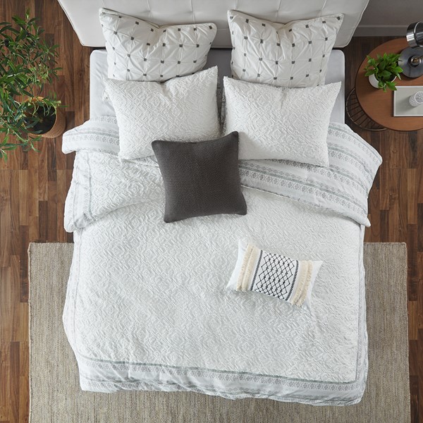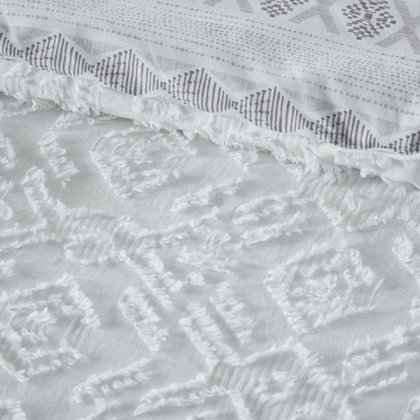 Create a rich farmhouse inspired look in your bedroom with the INK+IVY Mill Valley Reversible Cotton Duvet Cover Set. The top of the reversible duvet cover features white cotton clipped jacquard in the center with a printed Aztec-inspired border, for a stunning shabby chic look. On the reverse, a grey Aztec print coordinates with the one shown on top of the bed. Two matching reversible shams showcase the clipped jacquard pattern on one side and the Aztec print on the other to fully complement the clipped jacquard duvet cover. Made from 100% cotton, this reversible duvet cover set offers great value with two distinct looks and is machine washable for easy care. Button closures allow you to place a comforter insert within the duvet cover and inside corner ties help prevent it from shifting. Insert is NOT included.