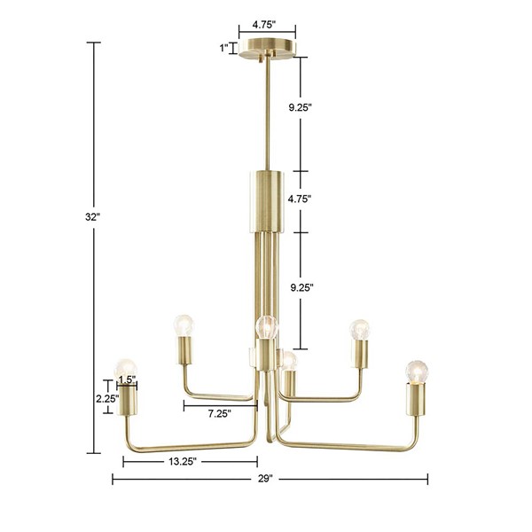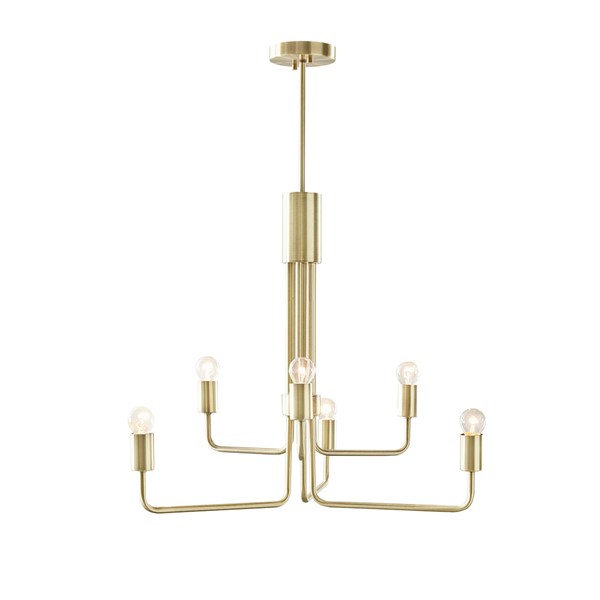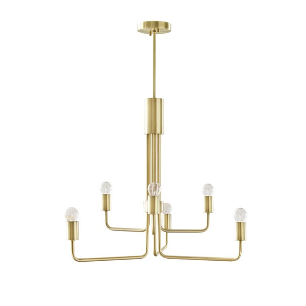 Modern design meets industrial style with the Milo 6-Light Metal Chandelier by INK+IVY. This chandelier showcases a unique cylindrical design, in an antique brass finish, with 6 arms that support 6 tubular light bulbs, for a sophisticated contemporary look. The ceiling also has an antique brass metal finish to complement the refined and polished aesthetic. Uses 6, E26 60 Watt Type B light bulbs (not included)