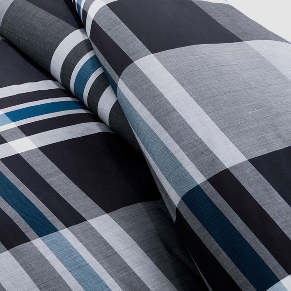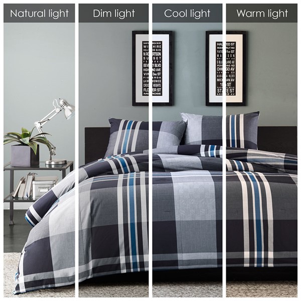 Elevate your bedroom decor with the modern styling of the INK+IVY Nathan Comforter Mini Set. This yarn dyed cotton comforter sports a bold plaid print in black and grey highlighted by stripes of blue and white, for a bold contemporary design. Hidden bartacking in the comforter secures the filling and creates a clean duvet-like finish. The 2 matching shams (1 in Twin) coordinate with the comforter to complete the sharp look. This plaid comforter set uses an antimicrobial treatment that provides built-in freshness protection, reducing the growth of odor causing bacteria to keep fabric lasting longer. Euro shams and decorative pillows are sold separately.