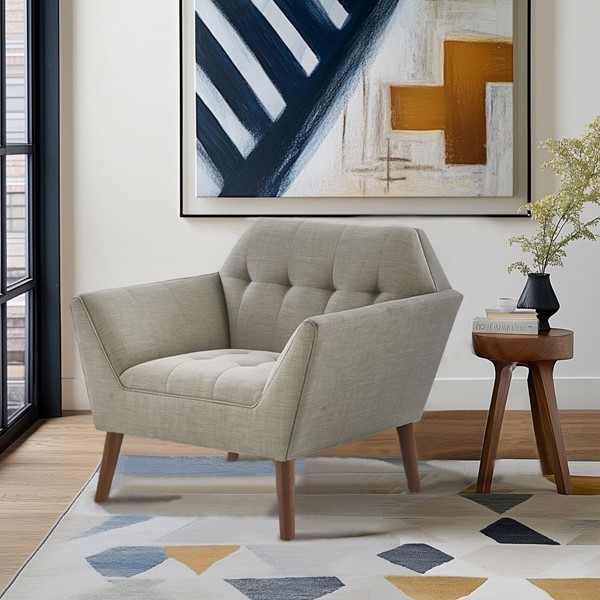 Elevate your living area with the mid-century allure of the INK+IVY Newport Upholstered Armchair. Featuring a wide 37-inch profile and a striking angular silhouette, enhanced by hand-tufted detailing, this chair makes a bold statement. The generously sized chair includes a tailored tight back and seat, offering plush, supportive comfort–perfect for lounging, reading, or relaxing. The plain, woven upholstery fabric made with filament yarn ensures durability and resilience to pilling. The solid wood legs add to its sturdy appeal. Ideal for the living room, bedroom, home office, and more, this versatile accent chair will transform your space. Bring home this stylish chair today!