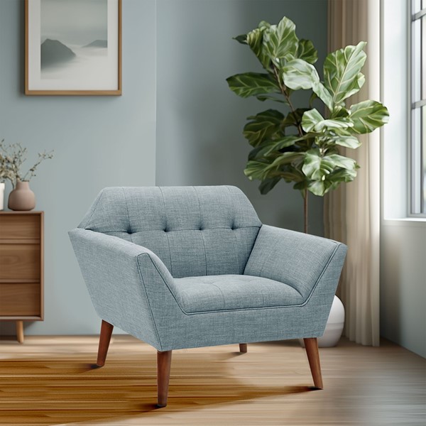 Elevate your living area with the mid-century allure of the INK+IVY Newport Upholstered Armchair. Featuring a wide 37-inch profile and a striking angular silhouette, enhanced by hand-tufted detailing, this chair makes a bold statement. The generously sized chair includes a tailored tight back and seat, offering plush, supportive comfort–perfect for lounging, reading, or relaxing. The plain, woven upholstery fabric made with filament yarn ensures durability and resilience to pilling. The solid wood legs add to its sturdy appeal. Ideal for the living room, bedroom, home office, and more, this versatile accent chair will transform your space. Bring home this stylish chair today!