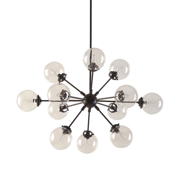 With its contemporary design, our Paige 12-Light Chandelier with Oversized Globe Bulbs adds intrigue to any space. This metal and glass chandelier features a one-of-a-kind look, with twelve clear glass shades and an adjustable base. An antique bronze finish provides a sleek modern touch to any living and dining rooms. We suggest professional installation. Twelve Type-B light bulbs are needed. Bulbs are not included.