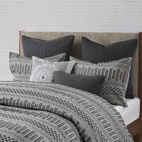Give your bedroom a comfortable farmhouse look with INK+IVY’s Rhea Cotton Jacquard Duvet Cover Mini Set. The grey cotton duvet cover features horizontal stripes, in black hues, with eyelash-looking woven details that add a charming accent to the top of the bed. Matching shams mimic the design seen on top of the bed completing the cotton jacquard bedding set. Made from 100% cotton, this jacquard duvet cover set is machine washable for easy care and provides a causal allure for your bedroom decor. A button closure allow you to place a comforter insert within the duvet cover and four inside ties on the corners help prevent it from shifting (Insert is NOT included). This bedding set is also OEKO-TEX certified, meaning it does not contain any harmful substances or chemicals, ensuring quality comfort and wellness. Items in the set may come in a rolled or compressed packaging, which will need to be fluffed up or steam ironed before use to remove wrinkles.