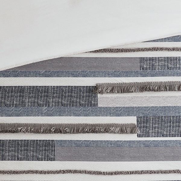 The Serena 3 Piece Cotton Printed Duvet Cover Set with trims offers a modern update to your bedroom. This soft, 100% cotton percale duvet cover features a navy and gray print with a subtle taupe accent print, for a chic artisanlook. The duvet cover also flaunts gray fringe and chenille trims that add texture and dimension to the design, while a solid white reverse provides a neutral touch. Also included are 2 matching shams to complete this cotton bedding set. Machine washable for easy care, this cotton printed duvet cover set uses an antimicrobial treatment that provides built-in freshness protection, inhibits growth of odor causing bacteria, and keeps the fabric newer, longer. Button closure allows you to place a padded insert within the duvet cover and inside corner ties prevent it from shifting (insert is NOT included).