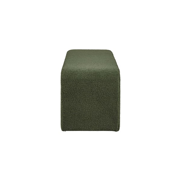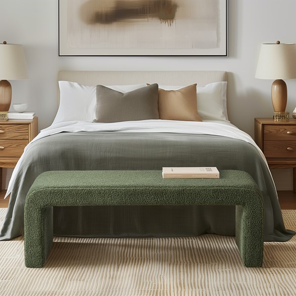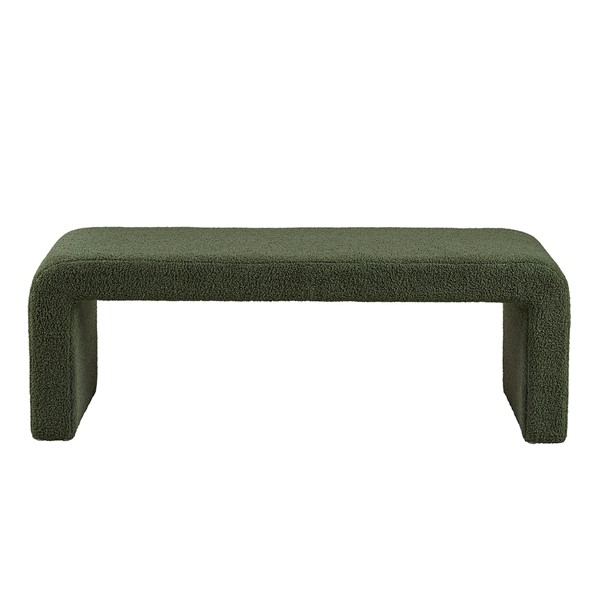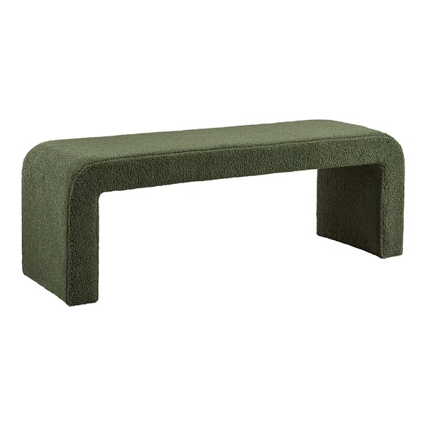 Steve bench has a sleek waterfall design with rounded corners and is upholstered in soft, textured boucle fabric. Perfect addition to any modern contemporary home and also provides a comfortable and cozy place to sit while putting on your shoes or in the bedroom as an extra seat. Requires no assembly.