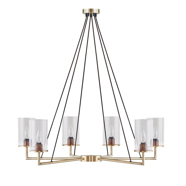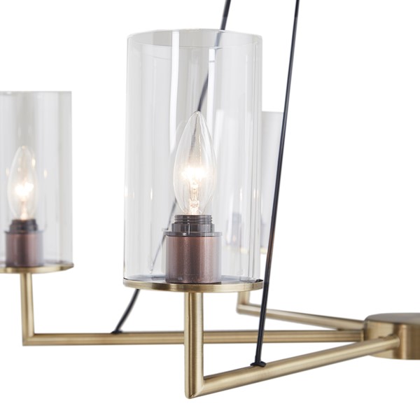 The Trenton 6-Light Chandelier with Cylinder Glass Shades by INK+IVY brings a simple, yet bold update to your home decor. This minimalist-inspired chandelier features 6 angular supports in an antique brass finish with upright lighting and glass cylinder shades, for a modern look. The antique brass ceiling mount complements the contemporary design, while the connecting cords emphasize the contemporary design making it a chic addition to your dining or kitchen space. Uses 6, E12, CFL 13W or LED 9W Type B light bulbs (not included)