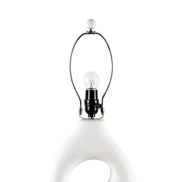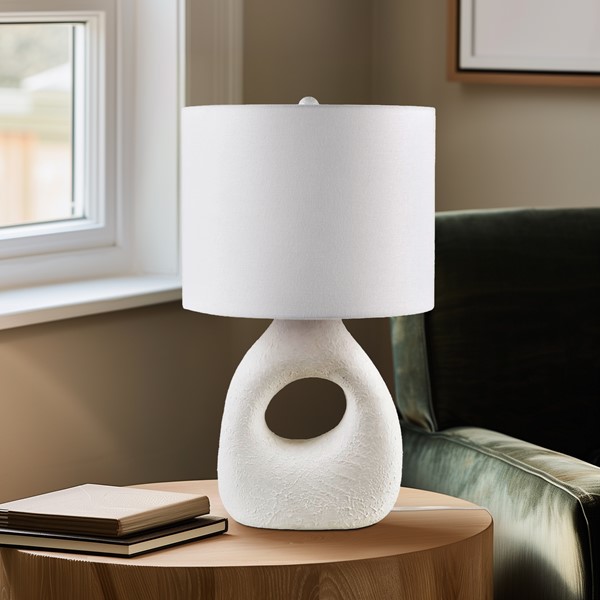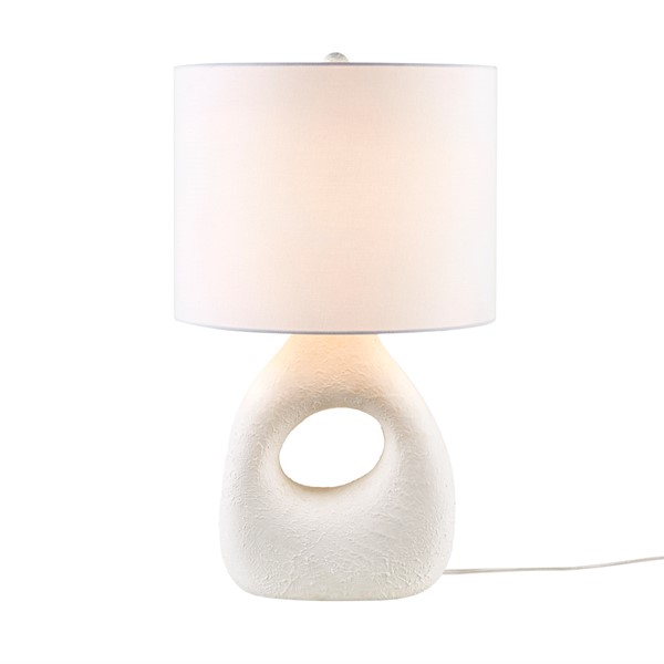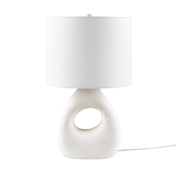 Brighten up your home with the INK+IVY Trilluxe Ceramic Table Lamp. This contemporary masterpiece features a uniquely shaped ceramic base in a textured matte-white finish, exuding casual elegance. Its white drum shade and matching finial radiate a warm glow, perfect for creating a cozy ambiance in any room. Enjoy instant illumination with the included 9W LED bulb. The lamp also offers convenience with its on/off rotary switch and 60" clear colored cord. Elevate your decor effortlessly with this stylish and functional lamp. Easily maintain its beauty with spot cleaning.