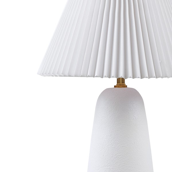 Elevate any space with the INK+IVY Veluna Ceramic Table Lamp. Its textured matte-white ceramic base and refined white tapered pleated shade infuse contemporary allure into your decor. With the added convenience of the included LED bulb, this lamp provides instant downward illumination and a welcoming ambiance. Paired with a coordinating finial and a user-friendly on/off switch, it seamlessly harmonizes style and functionality, making it an exquisite addition to any room.
