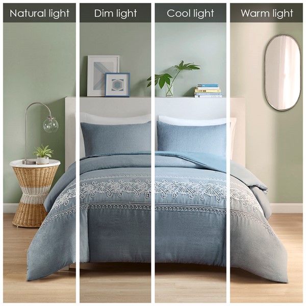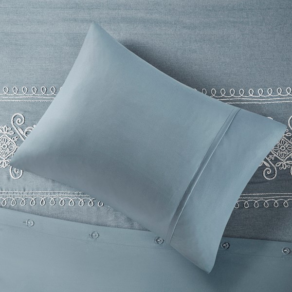 Bring a dreamy and romantic allure to your bedroom with the Intelligent Design Bree Embroidered Duvet Cover Set. This lovely blue duvet cover features beautiful white embroidery details at the foot of the bed that add an elegant touch of beauty. Matching shams (1 in Twin/TwinXL) complement the duvet cover and complete the casual look of the duvet cover set. Machine washable for easy care, this duvet cover set has an antimicrobial treatment that helps reduce the growth of odor causing bacteria and keeps fabric lasting longer. A button closure at the foot end allows you to place a padded insert within the duvet cover and internal corner ties prevent it from shifting (Insert is NOT included).
