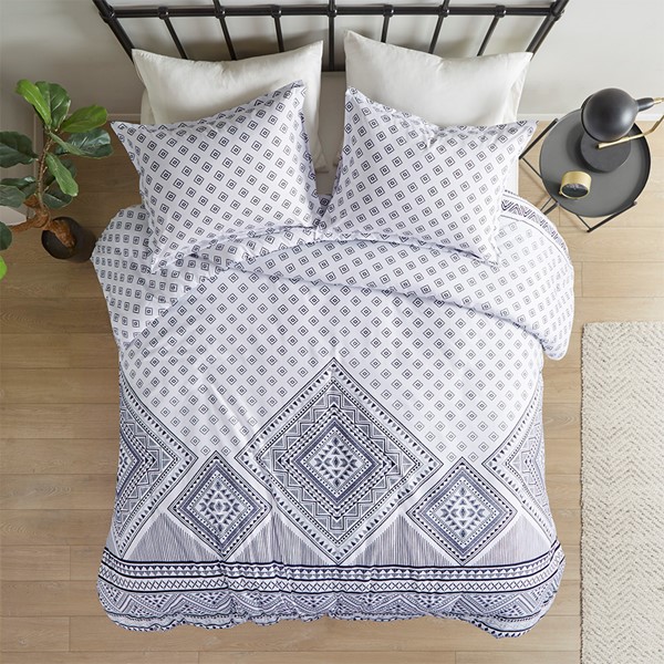 The Intelligent Design Camila Reversible Duvet Cover Set brings an eye-catching update to make your bedroom stand out. This reversible duvet cover features a bold contrasting geometric design with a small diamond pattern on the reverse for two distinct contrasting looks. The matching shams (1 in Twin/TwinXL) repeat the globally inspired design of the duvet cover to complete the modern bedding set. Machine washable for easy care, this reversible duvet cover set is OEKO-TEX certified, meaning it does not contain any harmful substances or chemicals to ensure quality comfort and wellness. An antimicrobial treatment helps reduce the growth of odor causing bacteria and keeps fabric lasting longer. A button closure at the foot end allows you to place a padded insert within the duvet cover and internal corner ties prevent it from shifting (Insert is NOT included).
