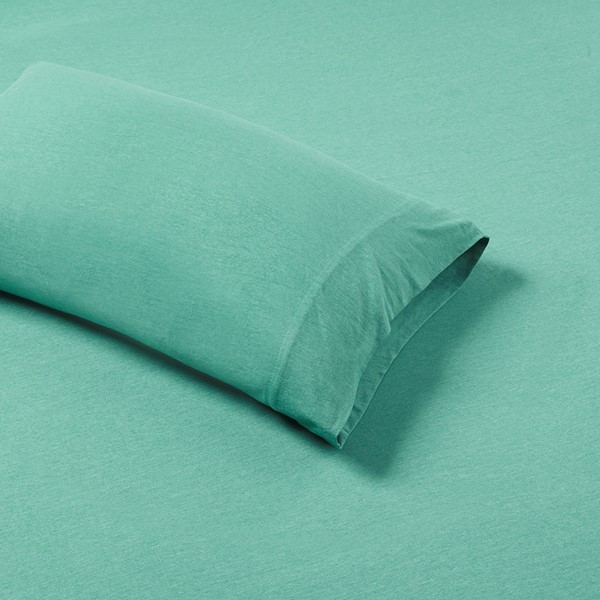 The all season jersey knit cotton blend sheet set is as comfortable as sleeping on your favorite tee. Unlike woven sheet set, this knit sheet set is easier to get into bed during cold weather or absorbent for summer. Choose from a variety of colors for comfort and style in your bedroom. Set includes 1 flat sheet, 1 fitted sheet and 2 pillowcases (1 in Twin size). Machine wash and tumble dry on low to prevent shrinkage. Fitted sheet fits up to 16 inches of mattress.
