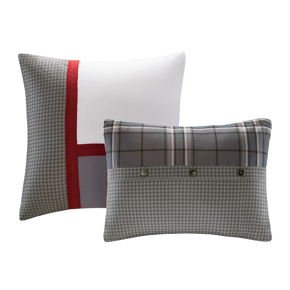 The Intelligent Design Daryl Comforter Set combines modern design with classic colors to create a sharp look. This comforter features a grey and white plaid print with a pieced design at the foot that is accented with button detailing. The 2 matching shams (1 in Twin/TwinXL) mirror the pieced look of the comforter, while 2 decorative pillows in coordinating colors add the finishing touches to this comforter set. This plaid comforter set uses an antimicrobial treatment that provides built-in freshness protection, reducing the growth of odor causing bacteria to keep fabric lasting longer.