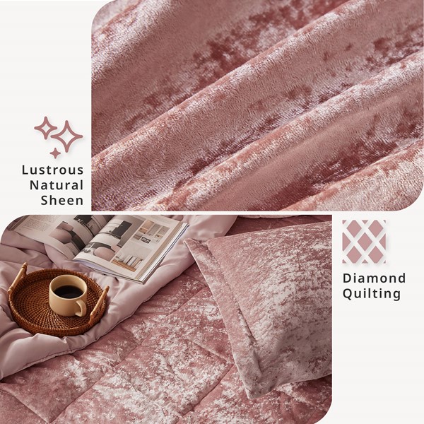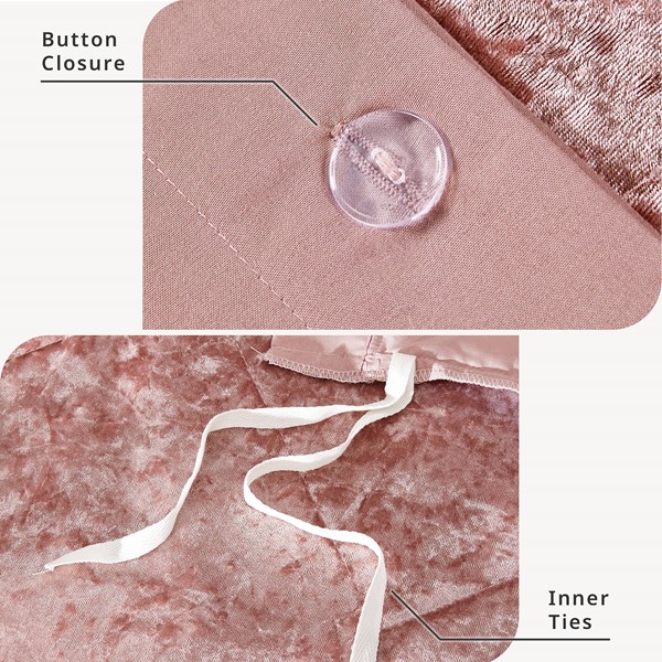 Create a luxuriously comfortable bedroom space with the Intelligent Design Felicia Velvet Duvet Cover Set. The crushed velvet, blush duvet cover features a quilted diamond top that adds dimension to the glamorous look. Matching shams (1 for Twin Sizes) coordinate with the velvet duvet cover, while an oblong decorative pillow provides a perfect finishing touch. Machine washable for easy care, this velvet duvet cover set brings incredible softness and comfort with a luxurious flair to your bedroom decor. Button closures allow you to place a comforter insert within the duvet cover and internal corner ties help prevent it from shifting (Insert is NOT included).