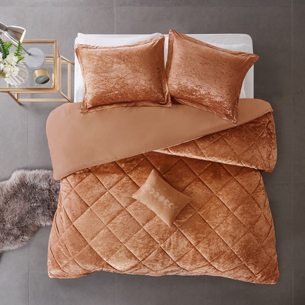 Create a luxuriously comfortable and lush bedroom space with the Intelligent Design Felicia Velvet Duvet Cover Set. The crushed velvet, rust duvet cover features a quilted diamond top that adds dimension to the glamorous look. Matching shams (1 for Twin/Twin XL Sizes) coordinate with the velvet duvet cover, while an oblong decorative pillow provides the perfect finishing touch. Machine washable for easy care, this velvet duvet cover set brings incredible softness and comfort with a glamorous flair to your bedroom decor. Button closures allow you to place a comforter insert within the duvet cover and internal corner ties help prevent it from shifting (Insert is NOT included).