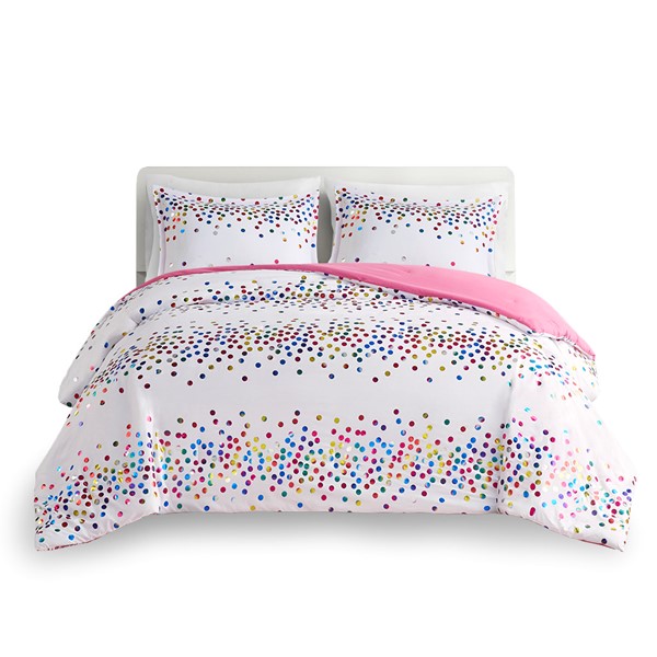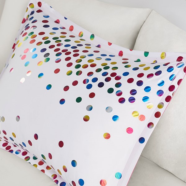 Make your bedroom sparkle with the Intelligent Design Janie Rainbow Iridescent Metallic Dot Comforter Set. Flaunting iridescent metallic dots all over the face of the comforter, this casual bedding set brings a vibrant and fun look to your bedroom. The matching shams (1 in Twin/TwinXL) complete the whimsical charm of the rainbow bedding to fully brighten your bedroom. Hypoallergenic polyester filling in the rainbow comforter contains no allergens and is treated to be dustproof. Machine washable for easy care, this sparkly comforter set is OEKO-TEX certified, meaning it does not contain any harmful substances or chemicals to ensure quality comfort and wellness. An antimicrobial treatment helps reduce the growth of odor causing bacteria and keeps fabric lasting longer. Items may come in rolled or compressed packing and will need to be fluffed up. Use a steam iron to help remove wrinkles easier.