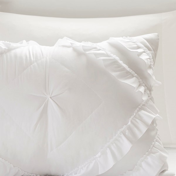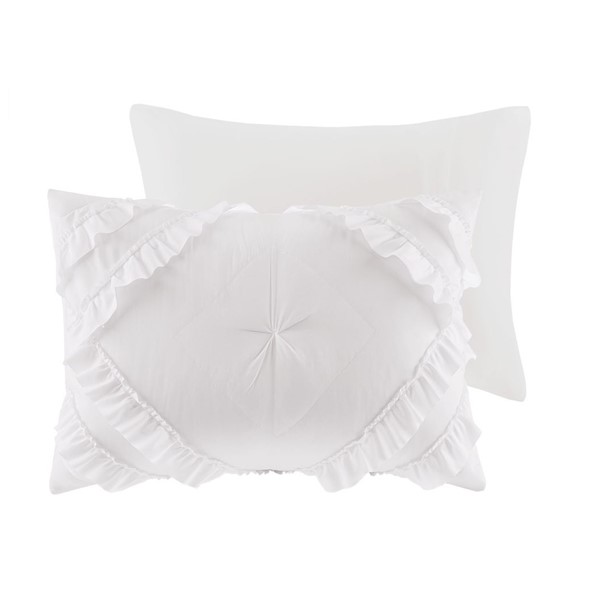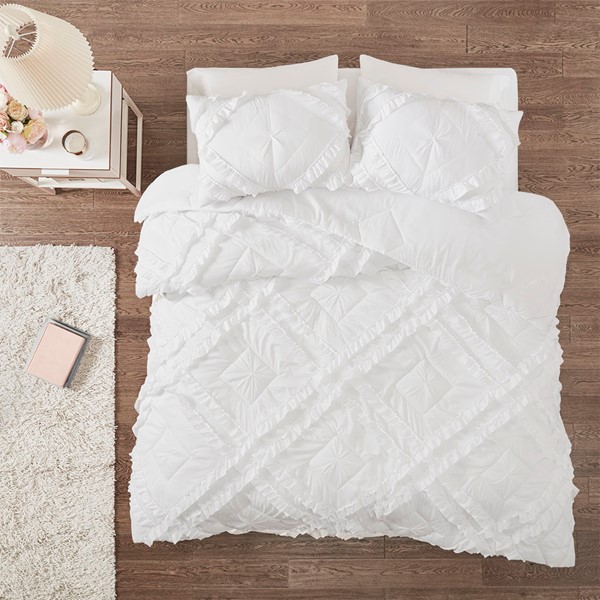 Create a cozy bedroom space with shabby chic style of the Intelligent Design Kacie Tufted Diamond Ruffled Quilt Set. The ultra-soft white microfiber quilt features a tufted diamond pattern with elegant ruffles, for a charming look. The 2 shams (1 in Twin/TwinXL) match the design of the quilt to complete cottage-inspired aesthetic. Cotton-filled quilting provides a soft feel and exceptional comfort. This bedding set uses an antimicrobial treatment that provides built-in freshness protection, reducing the growth of odor causing bacteria to keep fabric lasting longer.