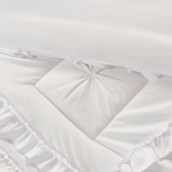 Create a cozy bedroom space with shabby chic style of the Intelligent Design Kacie Tufted Diamond Ruffled Quilt Set. The ultra-soft white microfiber quilt features a tufted diamond pattern with elegant ruffles, for a charming look. The 2 shams (1 in Twin/TwinXL) match the design of the quilt to complete cottage-inspired aesthetic. Cotton-filled quilting provides a soft feel and exceptional comfort. This bedding set uses an antimicrobial treatment that provides built-in freshness protection, reducing the growth of odor causing bacteria to keep fabric lasting longer.