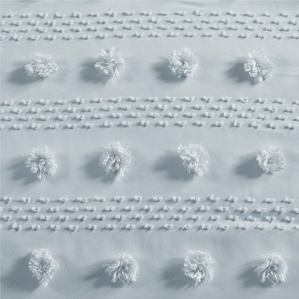 Refresh your bedroom with the elegant style of Intelligent Design’s Lucy Clip Jacquard Comforter Set. This beautiful comforter features fun and playful clip jacquard pompoms all over the face that add dimension to the top of the bed for a lovely look. The matching shams (1 in Twin/TwinXL) also flaunt the delicate design of the comforter to complete the jacquard bedding set. Hypoallergenic polyester filling in the fashionable comforter contains no allergens and is treated to be dustproof. Machine washable for easy care, this elegant comforter set is OEKO-TEX certified, meaning it does not contain any harmful substances or chemicals to ensure quality comfort and wellness. An antimicrobial treatment helps reduce the growth of odor causing bacteria and keeps fabric lasting longer. Items may come in rolled or compressed packing and will need to be fluffed up. Use a steam iron to help remove wrinkles easier.